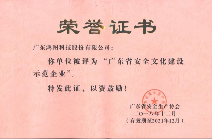 On January 8, 2019,the Guangdong Provincial Safety Production Association organized a 2018Guangdong Provincial Safety Culture Construction Demonstration EnterpriseExperience and Experience Exchange Meeting in Guangzhou. The meeting waschaired by Liang Dong, President of Guangdong Safety Production Association,and Zheng Hui, Secretary General. More than 100 people attended the safetyproduction related person in charge, representatives of safety cultureconstruction demonstration enterprises and news media reporters. Among them,Guangdong Hongtu Technology Co., Ltd. was awarded the honorary title of“Guangdong Province Safety Culture Construction Demonstration Enterprise” byGuangdong Safety Production Association.