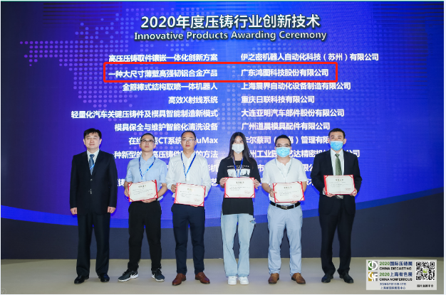 7月15日,第十五屆國際壓鑄博覽會暨2020上海有色合金及特種鑄造展覽會在上海新國際博覽中心舉行。鴻圖科技“一種大尺寸薄壁高強(qiáng)韌鋁合金產(chǎn)品”獲得“2020年度壓鑄行業(yè)創(chuàng)新技術(shù)”榮譽(yù)稱號。鴻圖科技壓鑄(本部)工程技術(shù)中心閆鋒博士受邀作為壓鑄行業(yè)專家之一出席會議并在同期舉辦的汽車輕量化發(fā)展論壇上代表公司發(fā)表題為“年度創(chuàng)新產(chǎn)品及技術(shù)-GZGX01”與“新能源汽車輕量化部件智能制造”的科技報告,上述報告獲得了與會專家的一致好評。