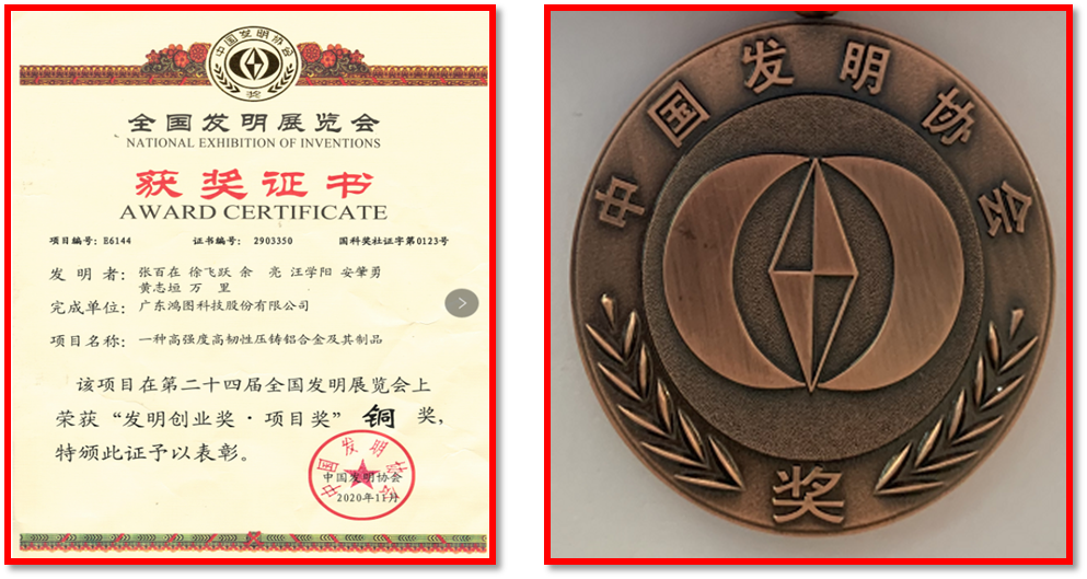 11月19日,2020年第二十四屆全國(guó)發(fā)明展覽——一帶一路暨金磚國(guó)家技能發(fā)展與技術(shù)創(chuàng)新大賽在佛山潭州國(guó)際會(huì)展中心舉行,鴻圖科技憑借“一種高強(qiáng)度高韌性壓鑄鋁合金及其制品”專利項(xiàng)目成功獲得全國(guó)發(fā)明協(xié)會(huì)“發(fā)明創(chuàng)業(yè)獎(jiǎng)·項(xiàng)目獎(jiǎng)”銅獎(jiǎng)。