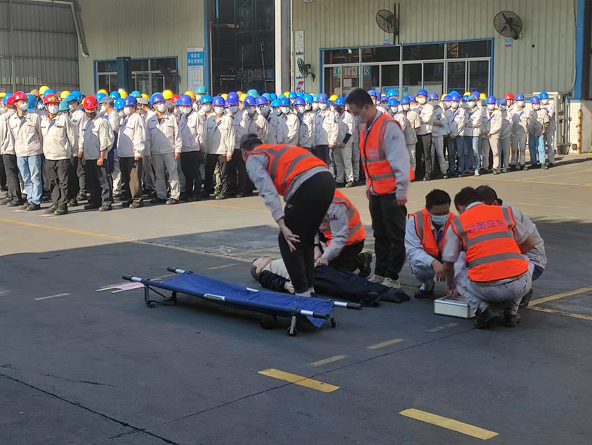 下午15點整,公司黨委書記、董事長、應(yīng)急實戰(zhàn)演習(xí)總指揮但昭學(xué)下達(dá)演習(xí)開始命令,演習(xí)正式開始。本次演習(xí)模擬了兩處火災(zāi)險情。情景一模擬公司中試車間液壓油管破裂引發(fā)火災(zāi)。在第一時間報警的同時,公司安全負(fù)責(zé)人迅速部署搶險工作,組織營救傷員,安排叉車隊轉(zhuǎn)移車間入口處的貨品,并對阻礙救援的車間鐵門進(jìn)行破拆。肇慶市消防救援支隊高要大隊消防人員抵達(dá)后,順利進(jìn)入火災(zāi)現(xiàn)場實施滅火,同時抵達(dá)的醫(yī)護(hù)人員立即對模擬昏迷傷員展開救治。通過多方協(xié)同作戰(zhàn),火情得到迅速撲滅,傷員得到及時救治。