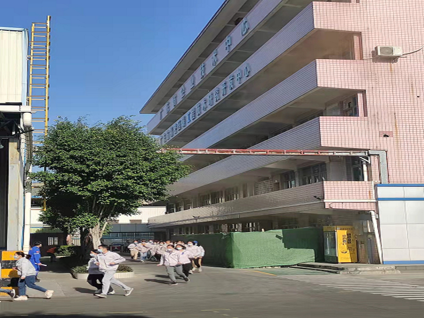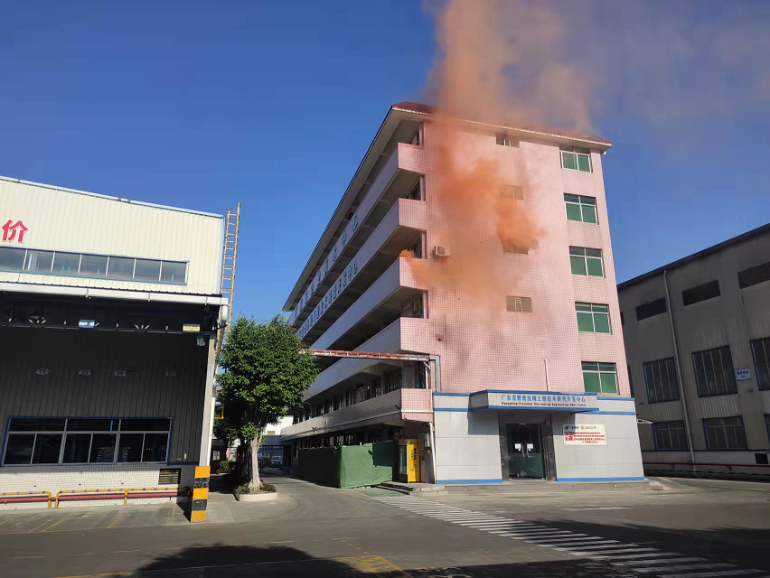 情景二模擬公司科研樓四樓因電線短路造成火災(zāi)?,F(xiàn)場人員第一時間報警,并使用干粉滅火器對起火點滅火。在火險警鈴響起后,各部門組織員工有序撤離到安全區(qū)域,整個過程僅用時1分56秒。消防人員抵達(dá)現(xiàn)場后,通過云梯成功將被困人員救出,并迅速控制火情。